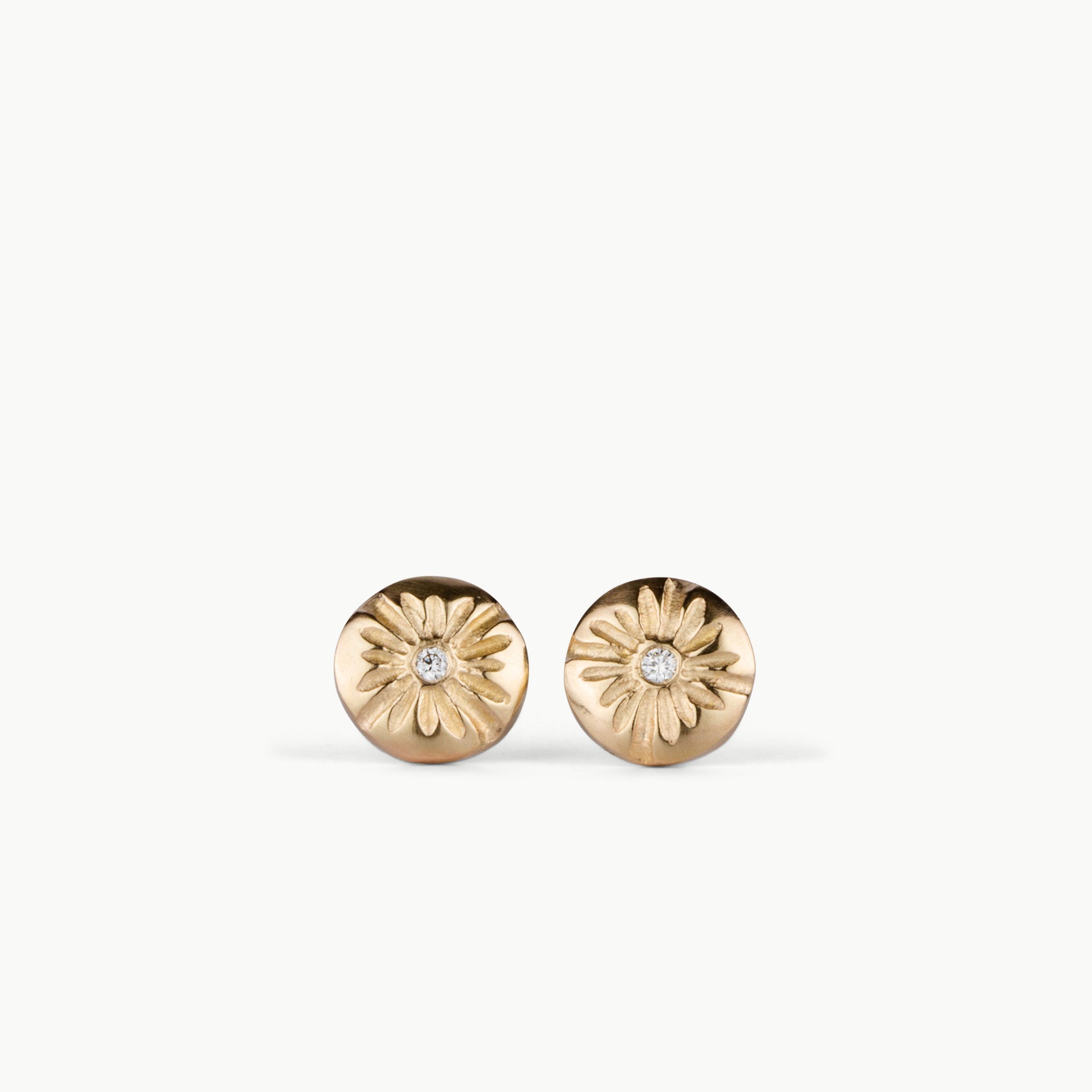 Our Small Gold Lucia Stud Earrings blend delicate detail with everyday luxury. Each hand-carved 14k yellow gold disc features an intricate sunburst pattern etched around a sparkling recycled white diamond center, creating an ethereal play of light and texture.