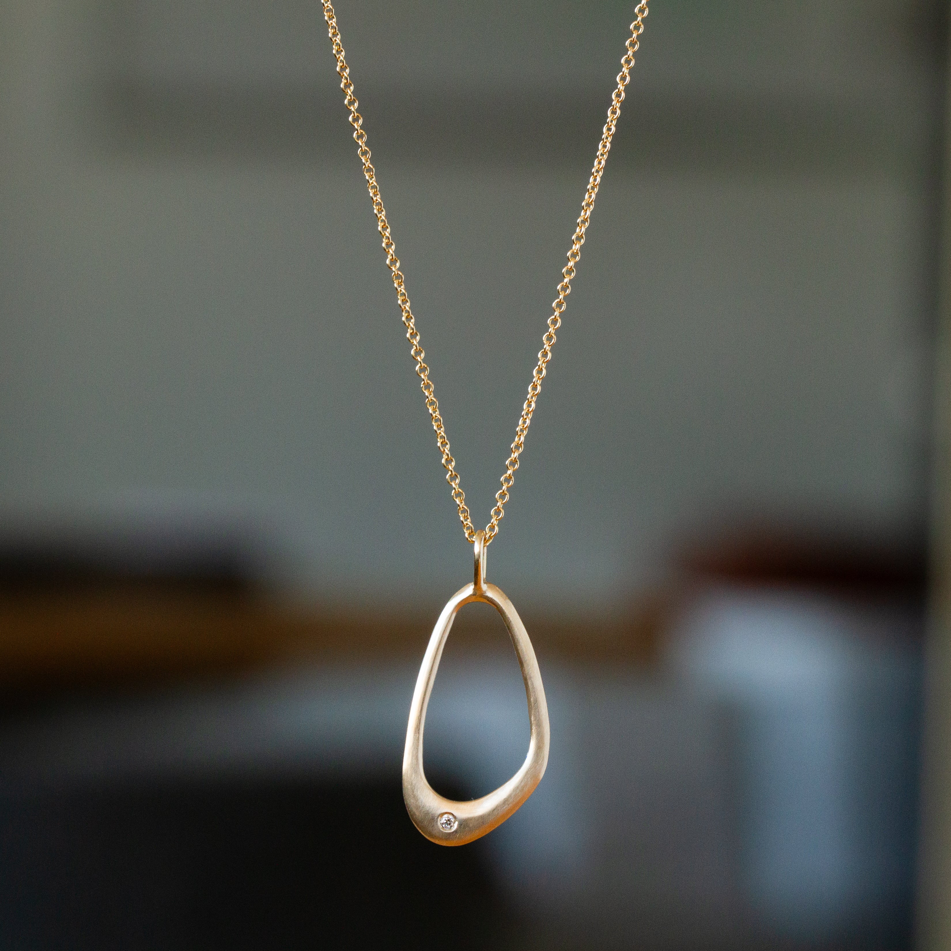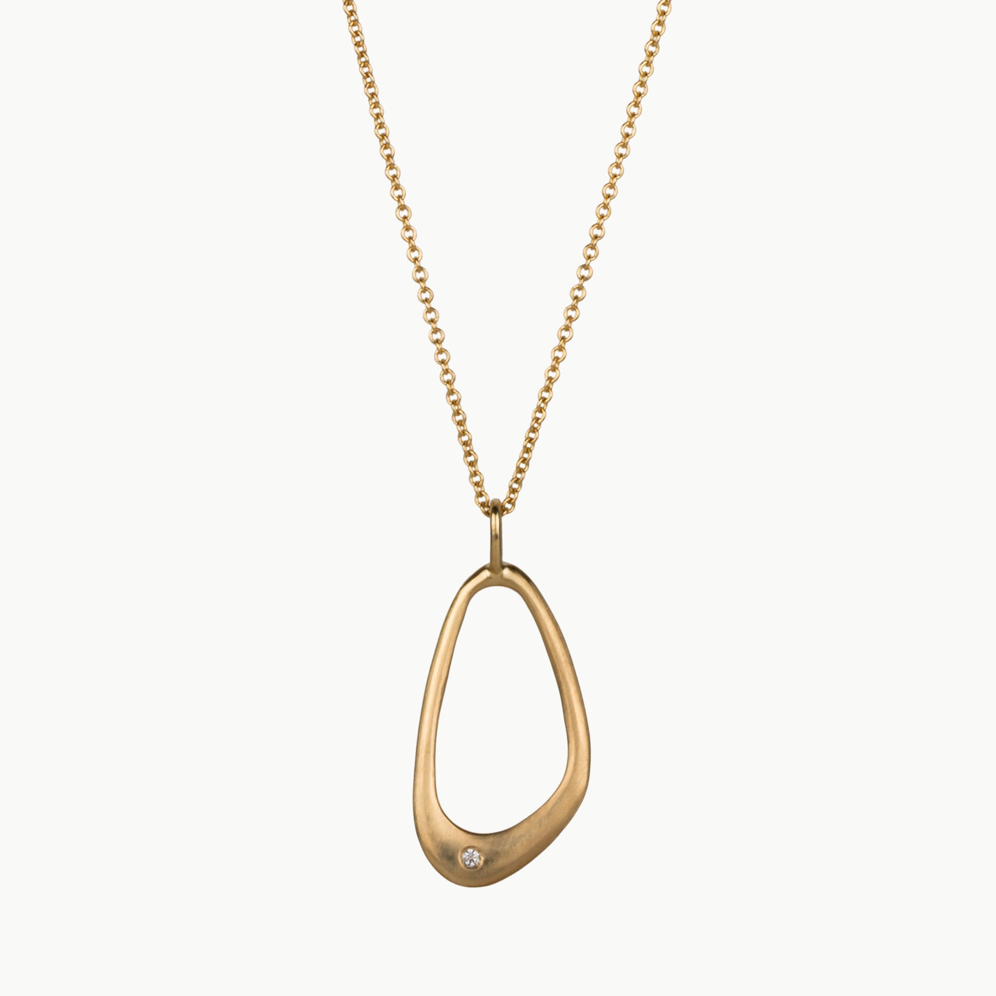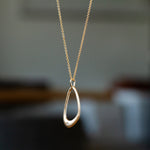 Capturing the ripple of a stone dropping in water, the hand-carved Wake Necklace features an open, sculptural form that moves gently as you wear it. Beautiful negative space draws the eye, while a single recycled diamond sits within the curved silhouette like a dewdrop caught in the wake's ripples. Suspended from a classic cable chain with adjustable length options, it works beautifully for both casual days and special occasions. This artistic pendant brings the poetry of water in motion to your collection of meaningful jewelry.